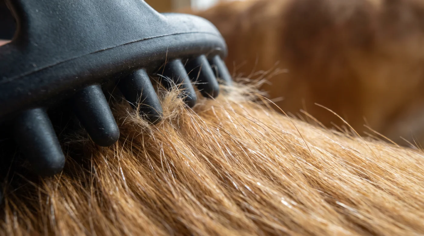 Senti un raschio sordo, quasi meccanico, mentre passi lo strumento lungo la schiena. A ogni passata, raccogli montagne di lanugine. Senti una profonda soddisfazione nel vedere quel mucchio crescere, convinto di aver liberato il tuo animale da un peso inutile e di aver salvato i tuoi tappeti.