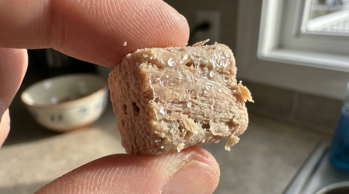 • Il test dell’acqua: Immergi un cubetto in mezzo bicchiere di acqua tiepida. La vera carne liofilizzata si reidrata lentamente, tornando palesemente fibrosa. Quella trattata con spray si sfarina in una poltiglia torbida in pochissimi secondi.