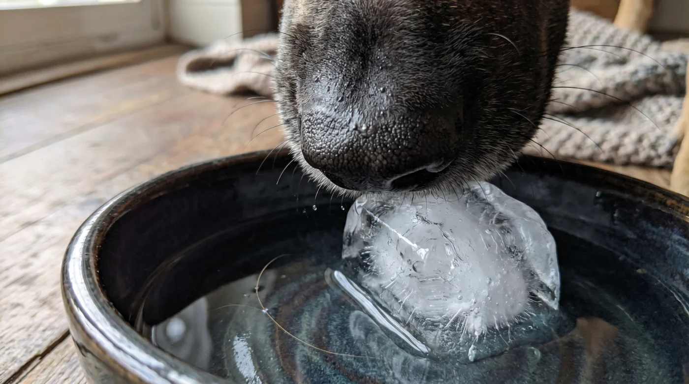 Nel cane, questa massiccia aerofagia riempie lo stomaco come un palloncino sotto pressione, creando esattamente le condizioni cliniche perfette per la sindrome da dilatazione-torsione gastrica (GDV). Quando lo stomaco si gonfia oltre il limite e ruota fisicamente su se stesso, chiude ermeticamente le vie d’uscita e blocca di colpo l’afflusso vitale di sangue agli organi interni. L’inserimento di ostacoli galleggianti cambia radicalmente la fisica stessa della deglutizione. I cubetti di ghiaccio non servono primariamente a raffreddare l’acqua, ma fungono da barriere mobili e imprevedibili. La lingua del cane deve calcolare costantemente la traiettoria, pescare l’acqua attorno ai blocchi di ghiaccio, e inevitabilmente perde il ritmo frenetico iniziale, riducendo l’ingestione accidentale di aria a quasi zero.