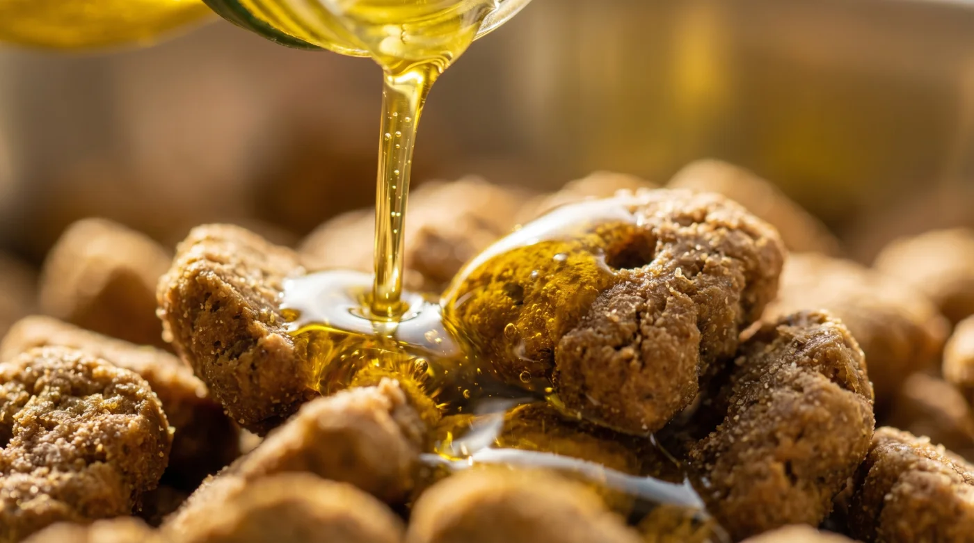 Il rumore è sempre lo stesso: un ticchettio secco e metallico di crocchette disidratate che colpiscono la ciotola di acciaio. Un suono che, a pensarci bene, ricorda la ghiaia da costruzione. Afferri la bottiglia di vetro scuro dal bancone della cucina. Il liquido dorato scende con una lentezza viscosa, rivestendo ogni singolo granello ruvido e poroso con una pellicola lucida a temperatura ambiente. Non c’è calore, solo il profumo pungente ed erbaceo dell’oliva spremuta a freddo che si mescola all’odore stantio della farina di carne estrusa. In quei tre secondi di versamento, hai appena alterato la meccanica digestiva del tuo cane. Hai trasformato un pasto potenzialmente abrasivo in una massa fluida, scorrevole e protettiva.