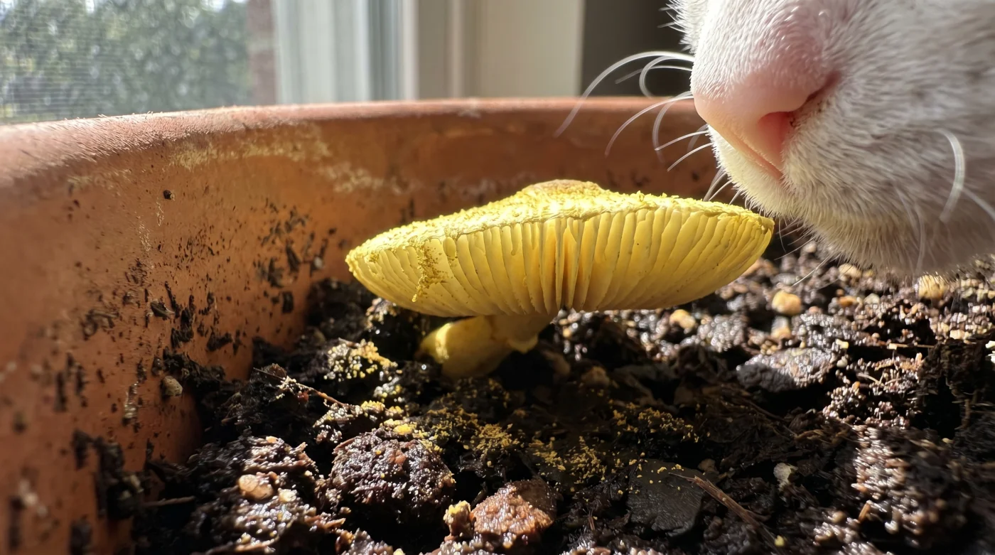 L’odore pungente di torba umida riempie l’aria del salotto dopo aver annaffiato la Monstera. Sulla superficie del terriccio, noti una macchia color zolfo. Non è muffa bianca o banale calcare. È una polvere sottile, quasi granulosa al tatto, che in poche ore si alza formando un minuscolo gambo giallo pallido. Sembra innocuo, un semplice effetto collaterale dell’umidità invernale in casa. Ma mentre il gatto dorme a due metri di distanza sul divano, ignorando la pianta, il Leucocoprinus birnbaumii sta già lavorando contro di lui. Non serve che il felino ne mastichi il cappello: le minuscole spore tossiche fluttuano invisibili a livello del suolo, posandosi sul pelo, pronte per essere ingerite durante la toelettatura quotidiana.