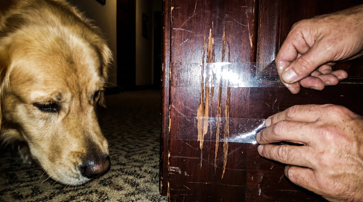 Per i cani di taglia grande o molossoidi, la spinta meccanica è enorme. Il nastro da imballaggio largo e liscio, applicato in strisce verticali e ben tese direttamente sul legno resistente, crea una pista di slittamento infallibile. Quando le zampe massicce perdono l’attrito col legno, l’appoggio posteriore del cane cede in sicurezza, costringendo l’animale a interrompere l’estensione e a tornare rapidamente con tutte e quattro le zampe sul pavimento, spezzando il ritmo della raschiatura.