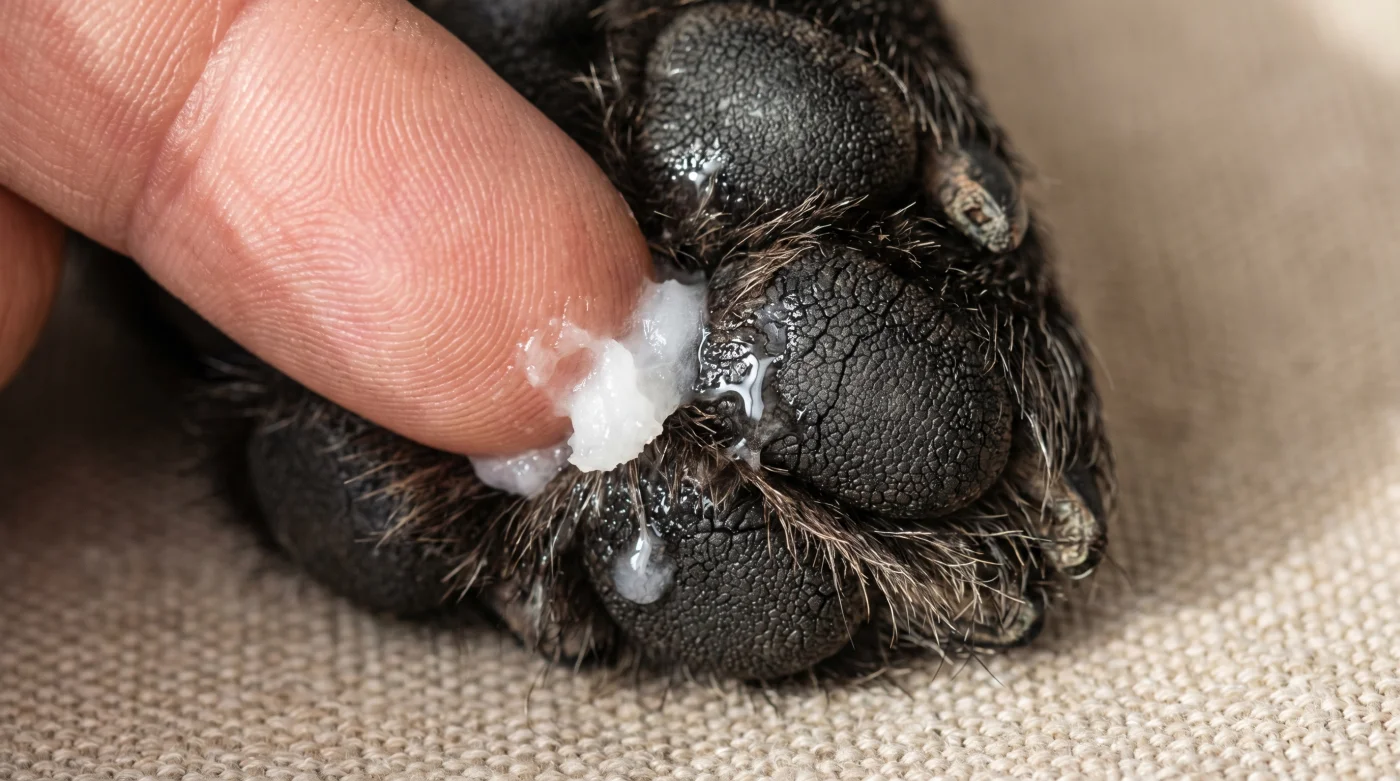- Scalda la dose: Preleva l’equivalente della punta di un cucchiaino per ogni zampa. Lavoralo tra i polpastrelli finché non scompare il colore bianco torbido.