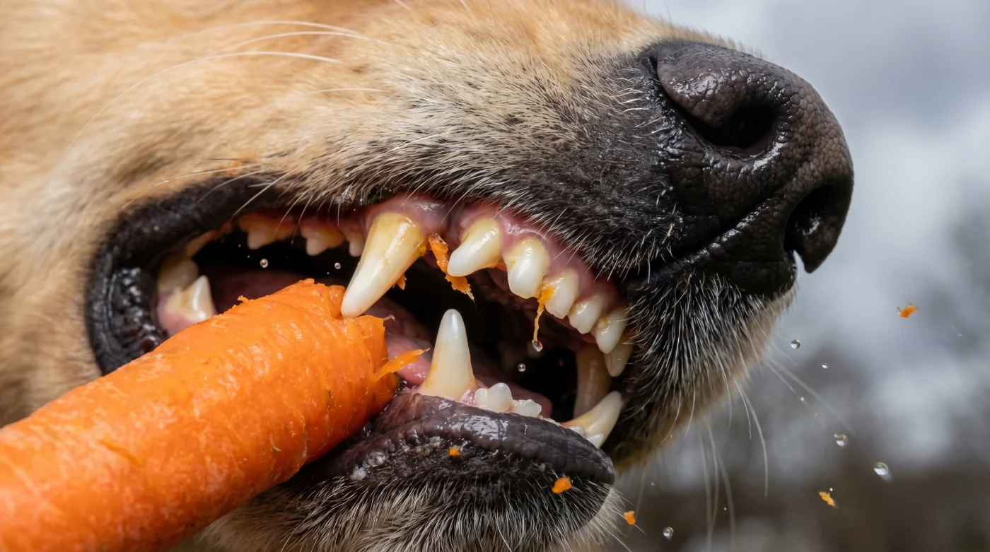 Qui entra in gioco la potente semplicità del concetto di spuntino duro. Una grossa carota cruda non è una semplice verdura per minestroni, ma un vero spazzolino biologico strutturato su misura per la bocca dei carnivori. Quando il cane inizia a masticarla, la polpa fibrosa, umida e densa della carota non si spezza subito, ma cede lentamente, creando un forte attrito fisico diretto contro lo smalto dei denti.