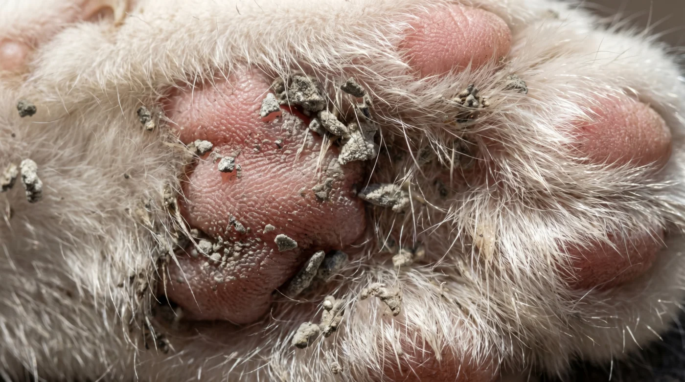 1. L’ispezione dei polpastrelli: Prendi dolcemente la zampa del gatto e premi leggermente la zona centrale per separare i cuscinetti morbidi. Devi cercare con attenzione residui grigi fortemente incrostati alla base del pelo interdigitale. Se presenti, puliscili immediatamente con una garza tiepida e umida. È il tuo primo vero indicatore di rischio zero.
