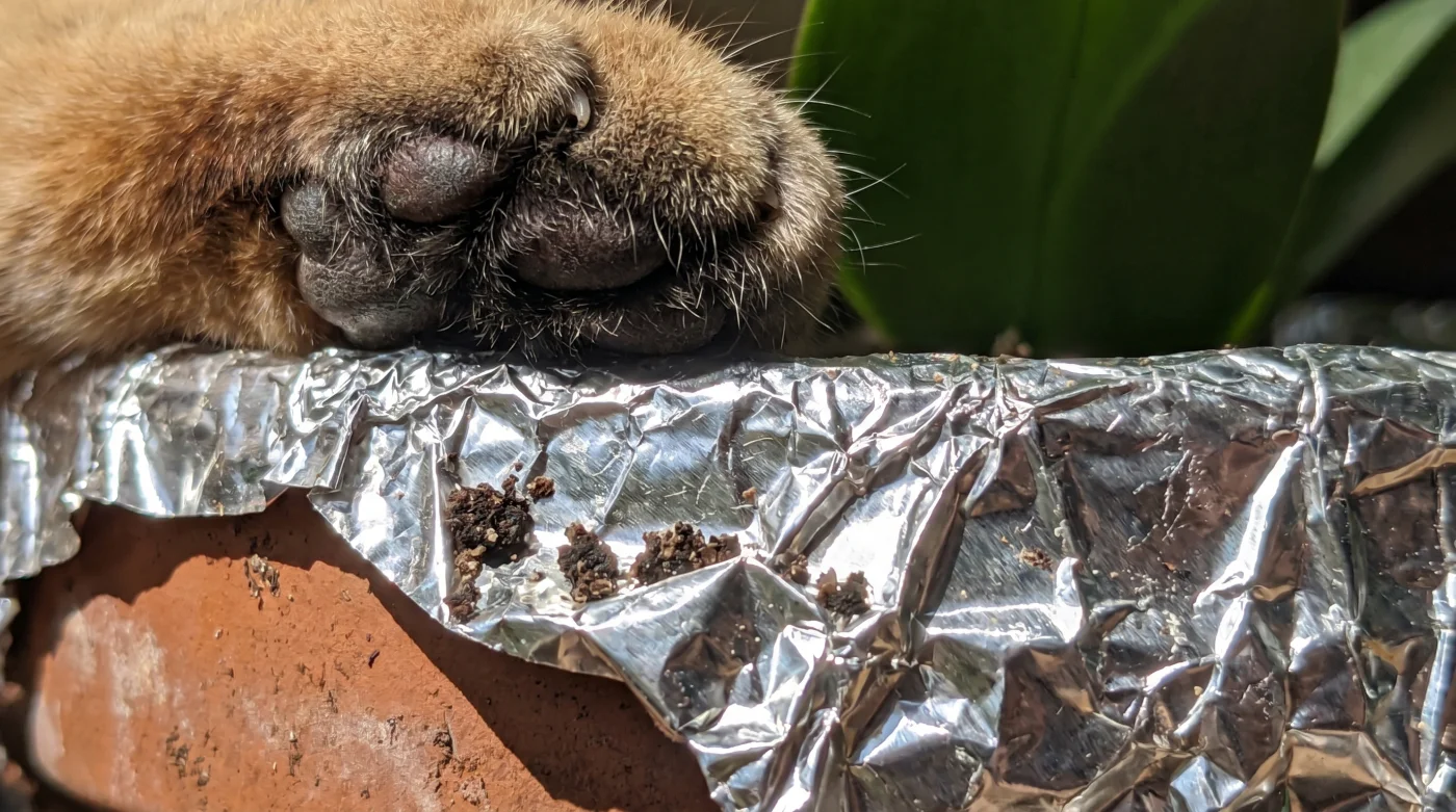 Se sei di fretta (Aggiustamento Rapido): Rinuncia alla copertura totale e modella decine di palline di carta argentata. Crea sfere irregolari grandi quanto delle noci e posizionale fittamente sopra la terra nuda. La resa estetica risulta meno invasiva, ma il disagio tattile sotto le zampe dell’animale si mantiene elevato e ugualmente efficace.